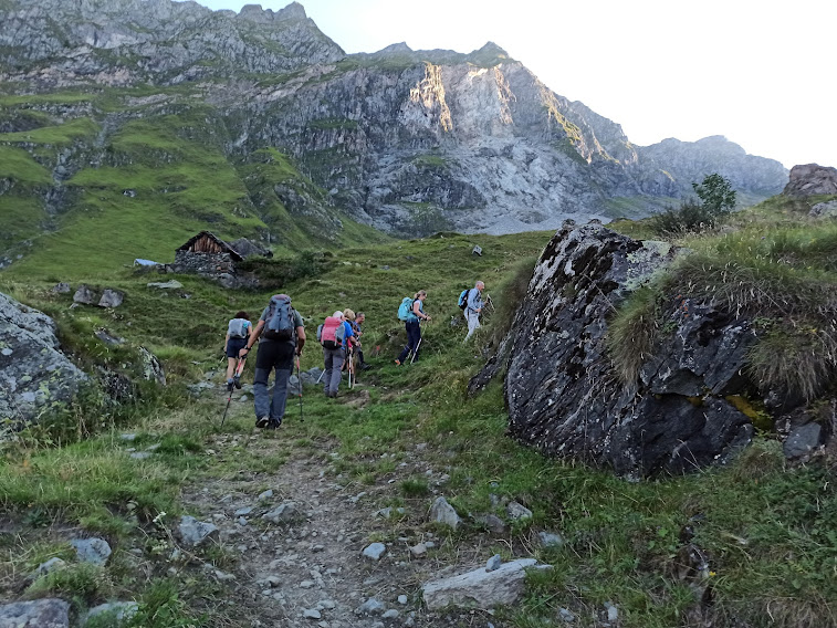 Alle 7.30, per prevenire un po’ le temperature africane previste per oggi, ci avviamo da Cheggio, 1474. Seguiamo il tragitto dello skilift, dove il nostro anziano ex alpinista diede negli anni scorsi il meglio di sé come istruttore di sci di giovani malcapitati. Proseguiamo sul sentiero evidente diretto a oriente verso il Passo del Fornalino. All’Alpe Meri Superiore, più in alto, vediamo tante vacche al pascolo. Al primo bivio teniamo la destra e, verso sud, saliamo all’Alpe Meri Inferiore, 1745, per una prima breve pausa. Siamo ancora, fortunatamente, in ombra. Con tanti tornanti e dolce pendenza arriviamo a Cavallo di Ro, 1894, dove ci aspetta il caldo sole d’agosto. Fino a qui abbiamo camminato poco più di un’ora.