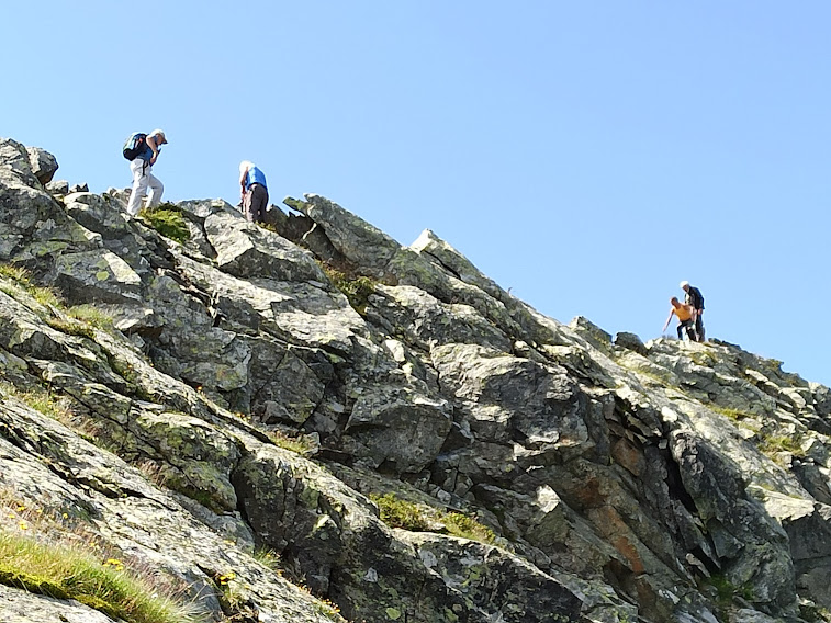 Viriamo nuovamente a oriente, sinistra, e, su pendio sempre più ripido e “a occhio”, saliamo alla selletta (2350) alla cui destra, pochi metri più in alto, c’è l’ometto di vetta del Pizzo Ciapè (2394). Un’ora e mezza dall’Alpe Pianozza. Ci manca solo un tratto di facili roccette. Sedici anni fa, a novembre, eravamo qui in quattordici ed eravamo saliti tutti in vetta. Eravamo più giovani. Solo in tre salgono oggi. Prudenza, stanchezza, caldo, scarse motivazioni ci frenano un po’. Dopo la parziale conquista della vetta ci abbassiamo fino al pianoro sottostante (mezz’ora) e mettiamo qualcosa sotto i denti. Sempre con percorso libero, adesso verso occidente, ci abbassiamo agli ennesimi ruderi, quelli dell’Alpe Pianello Superiore, 2089. Di qui scendiamo in linea di massima pendenza su prati ripidi fino ad incrociare finalmente un sentiero degno di tal nome, SG (sentiero geologico) per la cartina, che collega gli Alpi di Cama con Cavallo di Ro.