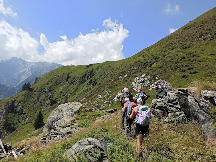 Giornata splendida, ma con il caldo che ci segue anche sopra quota duemila. Siamo in nove con tre gentili signore, di quelle “toste”: capisco subito che oggi mi toccherà arrancare in coda al gruppo, pagando a caro prezzo due settimane di inattività e qualche giorno di ozio totale in riva al mare. Ci sono due esordienti ed un anziano ex alpinista che combatte la vecchiaia e i problemi fisici andando in montagna quasi tutti i giorni.