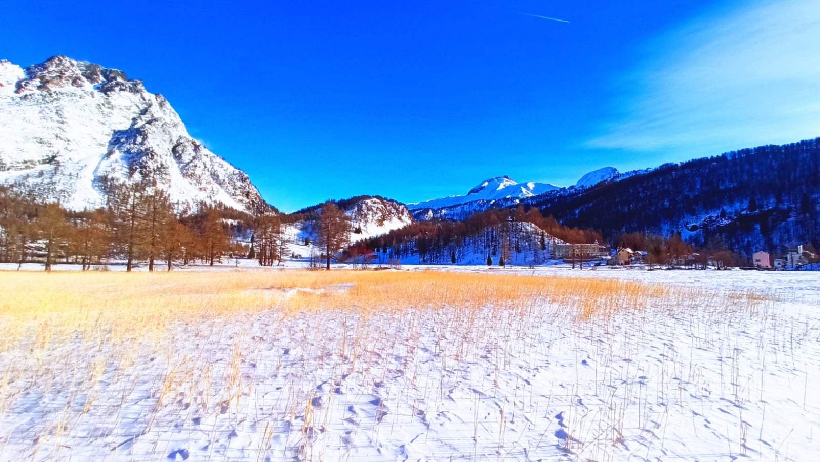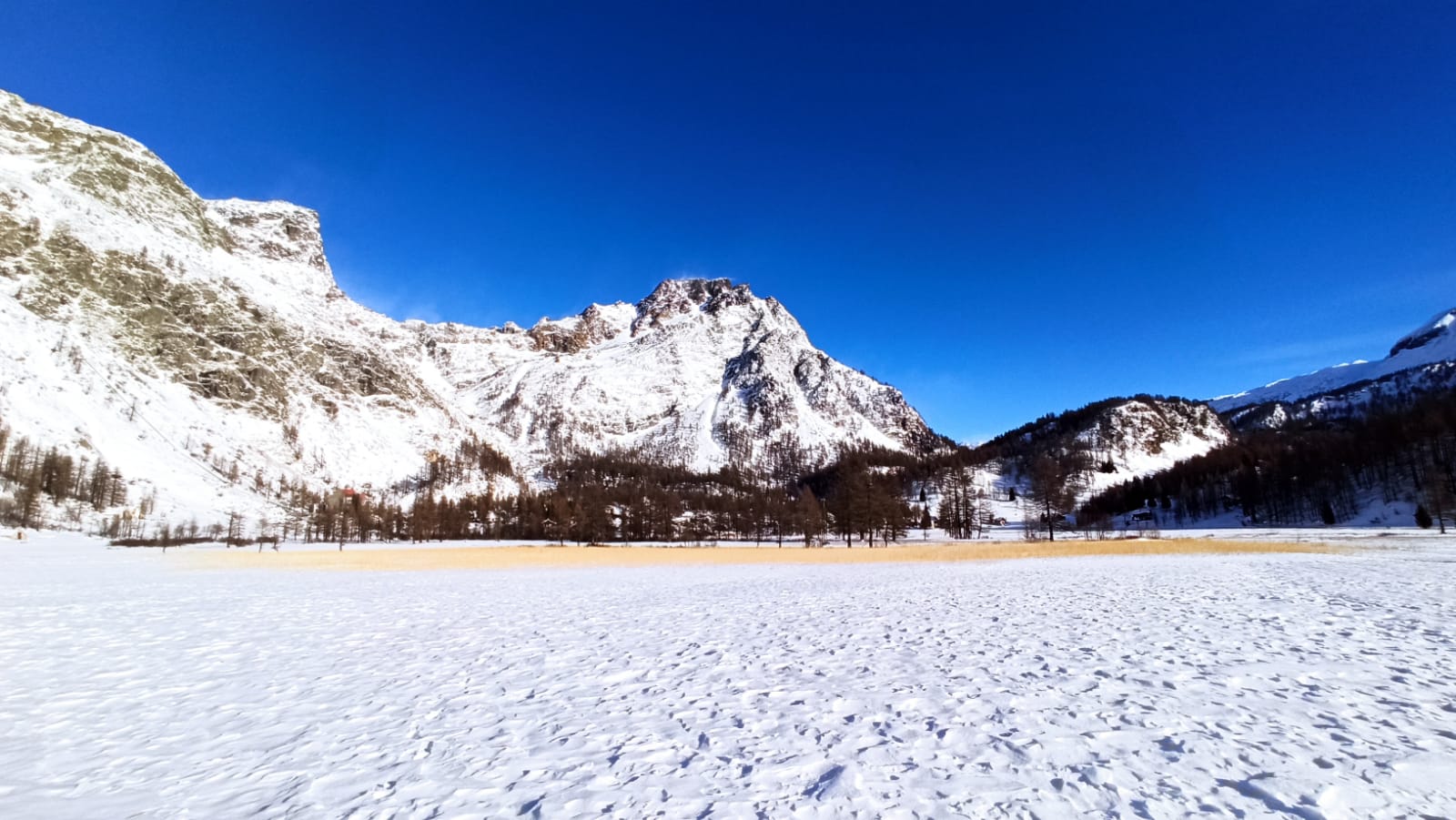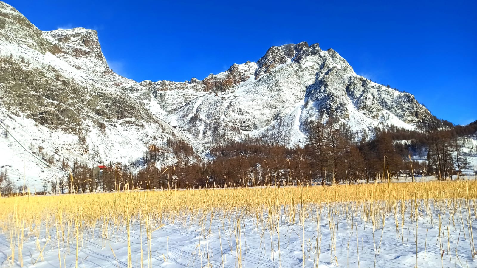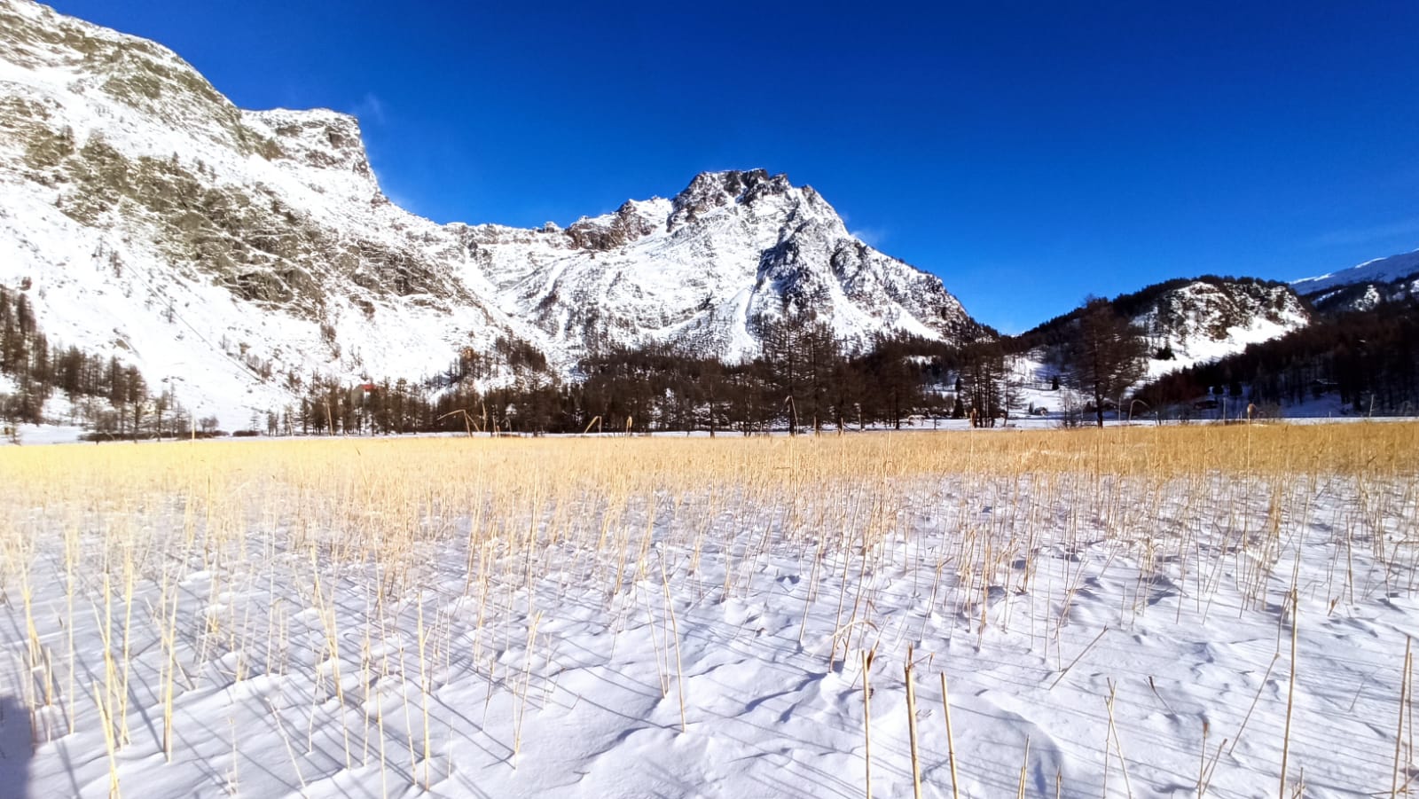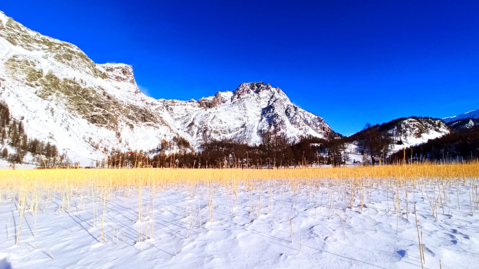 DEVERO- 12-12-2021-- Nel parco dell'alpe Devero la prima neve ha candidamente coperto di bianco tutto il paesaggio. Ma nella piana che si erge alle porte del parco, proseguendo verso la frazione di Pedemonte, è il canneto d'oro (e protetto) che fa bella mostra di sé, quando la poca neve al suolo fa risaltare i fusti gialli dei vegetali baciati dal sole del primo mattino. Uno spettacolo visibile in questi giorni di primo vero inverno in quota, che merita di essere osservato con rispetto verso la natura incontamiinata di questi luoghi.