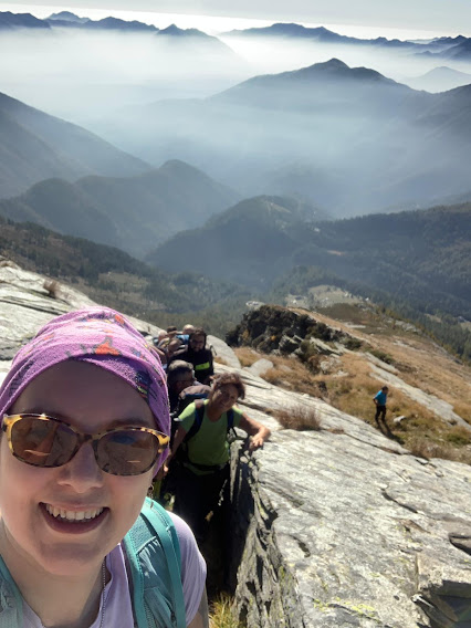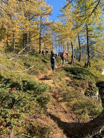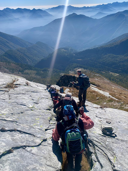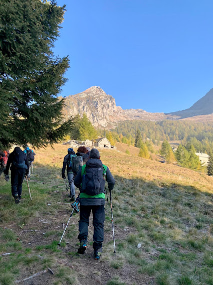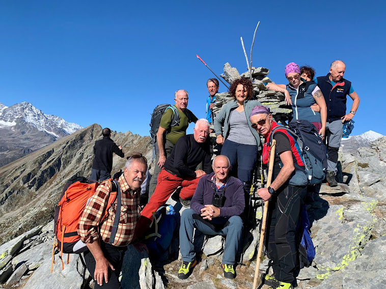 Record di presenze per i Murmäta. Dieci anziani ed un quasi giovane sono accompagnati oggi da due esperte signore e da una giovane, bella e forte signorina, che svolge la professione più adatta all’età media del gruppo: infermiera professionale. Lo staff medico sanitario è completato da un altro infermiere professionale e da tre esperti medici: sembra una gita sociale dell’ASL VCO. Siamo in una botte di ferro in questa splendida giornata autunnale, senza nuvole e con una fresca temperatura ideale per camminare.