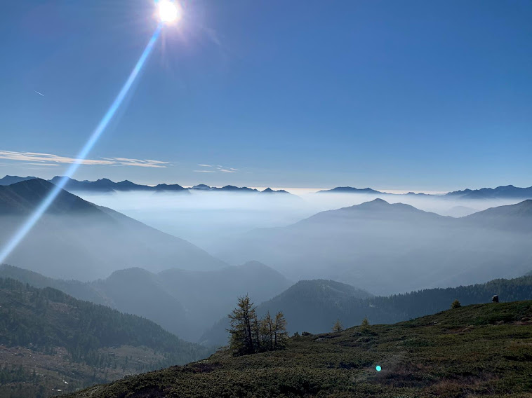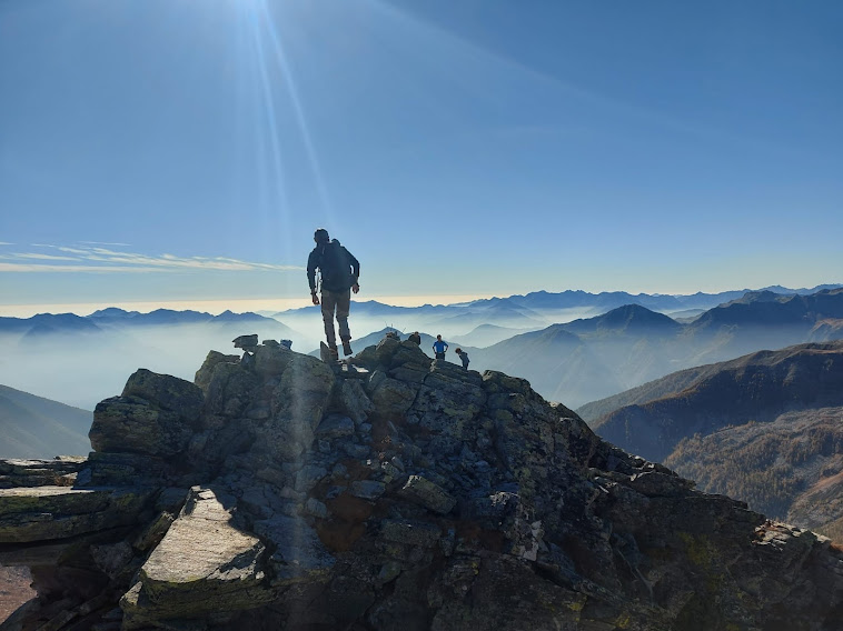 Capiamo perché le calzature non adatte sono la principale causa di incidenti in montagna: i fungiat della domenica ce lo insegnano. In dieci minuti sono (gli altri, io dopo qualche minuto) all’ometto di vetta della Costa del Dosso, 2487. Ad oriente i tre Laghi di Paione, ad occidente il Lago di Agro, che qualcuno chiama di Arza, e la grande conca che porta al Monscera. E si vede proprio tutto, compresi i quattromila fino al Rosa. Purtroppo si vede anche la cappa dello smog che respiriamo a valle ogni giorno.