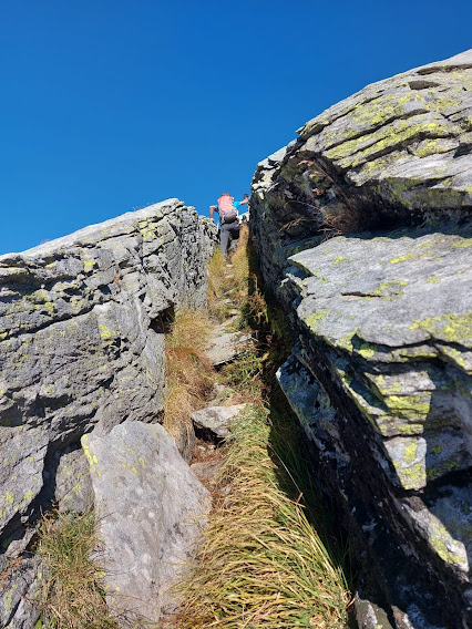 Mi dovrò cercare un gruppo più anziano, ma non è facile. Un’ora dall’Alpe Paione. Il quasi giovane torna sui suoi passi per un problema alla caviglia, mentre gli anziani, come immaginavo, accelerano sul pendio sempre più ripido e io li seguo …. col pensiero. Finiscono i prati dopo tre quarti d’ora ed accediamo alla piodata finale attraverso una spettacolare scanalatura fra due strati di solido granito. Il terreno è ripido, ma la roccia perfettamente asciugata dal sole esalta la buona aderenza dei nostri scarponi e non ci sono problemi.