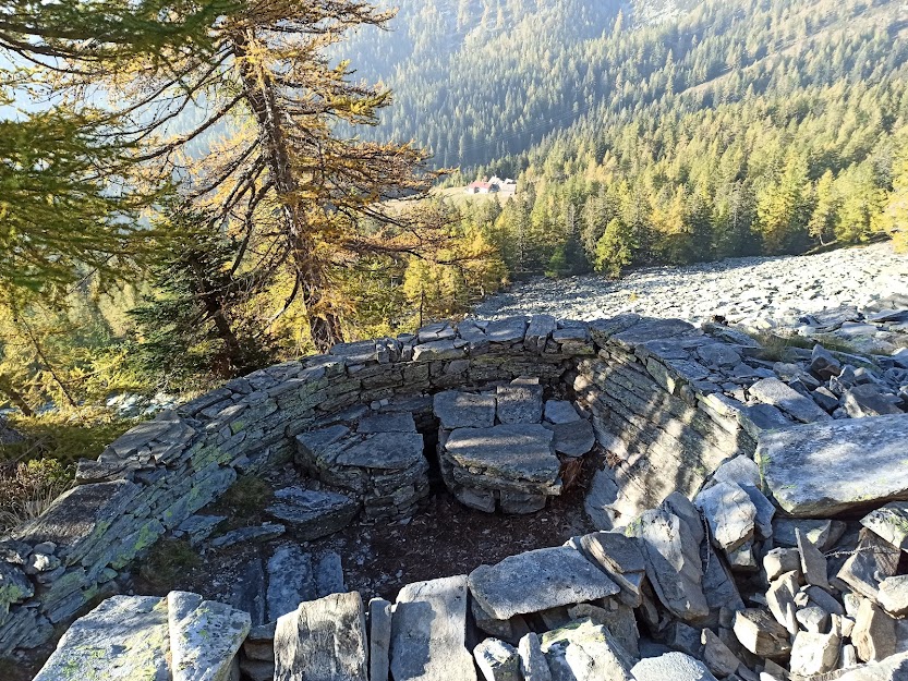 Qui, tenendo la destra, imbocchiamo il sentiero evidente e, al primo bivio, ancora nel bosco, puntiamo a nord (sinistra), raggiungendo i prati dell'Alpe Paione, 1780, in poco più di mezz’ora. Superato il rifugio (privato e chiuso), attraversiamo la strada e teniamo la destra. Subito incontriamo il sentiero, sempre ben segnato, che sale (sinistra) verso i fortini militari e la Costa del Dosso. Un primo tratto nello splendido bosco di larici e, a quota 1900, raggiungiamo il primo fortino militare in una zona di grandi pietraie. In tutto sono quattro, sormontati da un posto di comando.