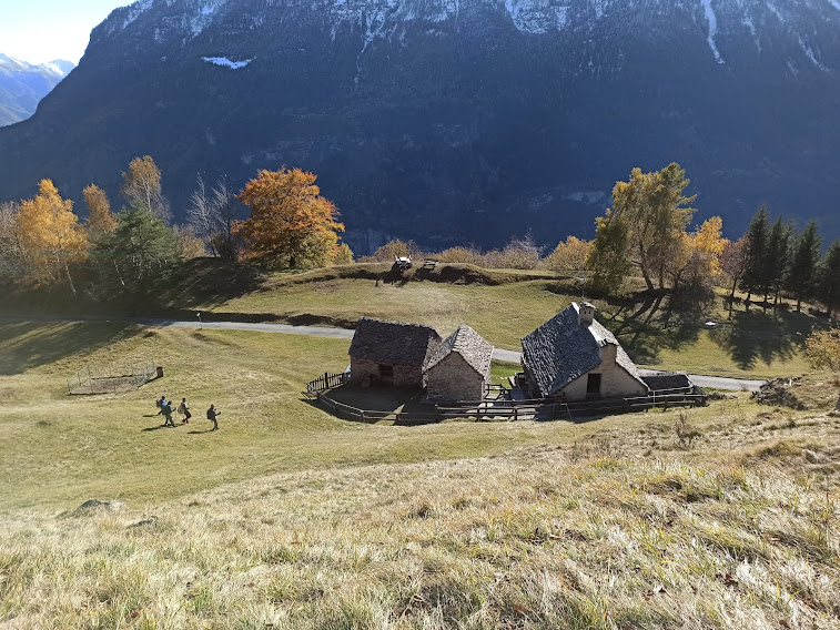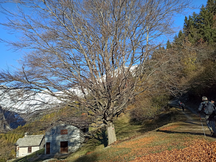 Seguiamo la strada fino al primo tornante e qui imbocchiamo, sulla sinistra, il sentiero per l’Alpe Chiosso (o Chioso), 1230, che raggiungiamo attraversando questo primo bosco in direzione nord ovest con passo tranquillo, mentre sorge il sole che comincia ad esaltare i colori autunnali. All’Alpe Torba, 1323, dopo poco più di un’ora e un quarto, incontriamo una pista “agro silvo pastorale”, come ci conferma il cartello dei lavori che dovrebbero essere stati ultimati l’estate scorsa.