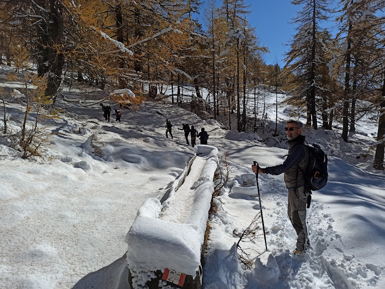 Attraversiamo con saliscendi fino all’Alpe Fontana camminando in quasi mezzo metro di neve. Condizioni da ciaspole, ma ormai siamo al punto più alto dell’escursione odierna e cominciamo la discesa. Ci fermiamo per il pranzo nel bosco di larici, più in basso, in prossimità di una baita ( Saslasc ?) (venti minuti). Si brinda, ahimè, al compleanno del grafomane ufficiale del gruppo Sempre con calma, dopo spumante, assaggi di torte, caffè e ammazza-caffè artigianali si riparte, pestando sempre meno neve e passando nei pressi dell’Alpe Calandra.