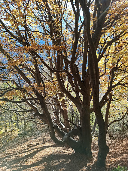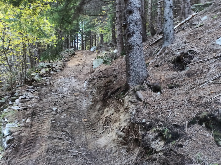 Tagliando qualche tornante della strada su sentiero segnato arriviamo all’Alpe Salera, 1203, e, restando sul sentiero, passiamo in un tratto di bosco dove si trovano dei faggi spettacolari, che meritano lunga vita. Riprendiamo la strada e, dieci minuti prima del parcheggio, incontriamo, sulla nostra destra, l’ennesima pista agro silvo pastorale, probabilmente in costruzione. Non ho più parole.
