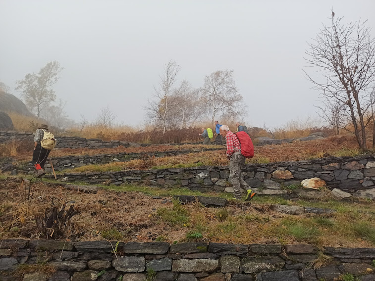 A quota 800 incrociamo ancora la strada che sale dal Boden. Ci teniamo a destra e, poco sotto, troviamo un grande recinto dotato di ogni confort, dove vivono cinquanta capre, come ci racconta il pastore. Torniamo per l’ultima volta sulla strada all’Alpe Ronch, 730, in corrispondenza di un’area dove si apprezza l’enorme lavoro di chi ci abita: assomiglia al giardino di un villaggio vacanze. Insieme all’altro autista mi porto avanti, sempre lungo la strada, passando da Casalecchio II, per recuperare le auto (un’ora e un quarto) e risalire alla Trattoria del Boden, dove un ottimo pranzo conclude in bellezza la giornata.