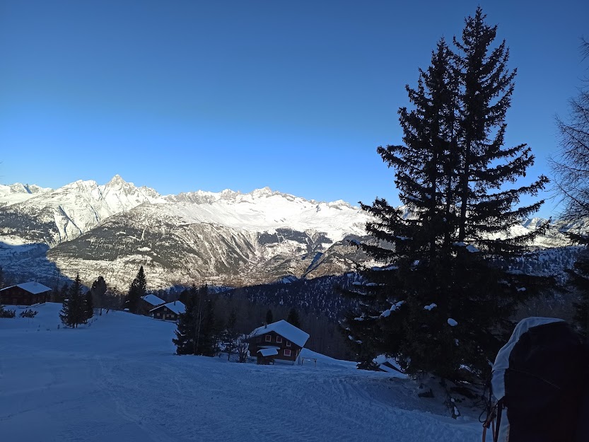 Quanti bei ricordi, ma abbiamo ancora la fortuna di trovarci in questo paradiso, con un panorama incredibile dai Quattromila del Sempione all’Oberland Bernese. Durante la discesa ci godiamo le ciaspole sulle linee di massima pendenza della ripida pista, battuta solo dagli sciatori.