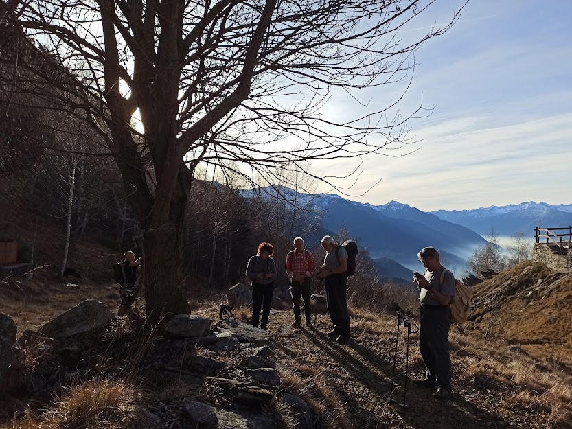 Abbassa l’età media dei cinque anziani la nostra fedele badante, unica rappresentante odierna dell’etnia verbanese. Gli altri lacustri prediligono la neve, anche quando non c’è. Il sentiero, a tratti molto ripido, scalda subito i muscoli intorpiditi dagli ozi natalizi e, in meno di mezz’ora, ci porta a Veglio, 540.