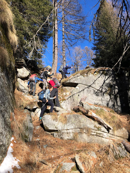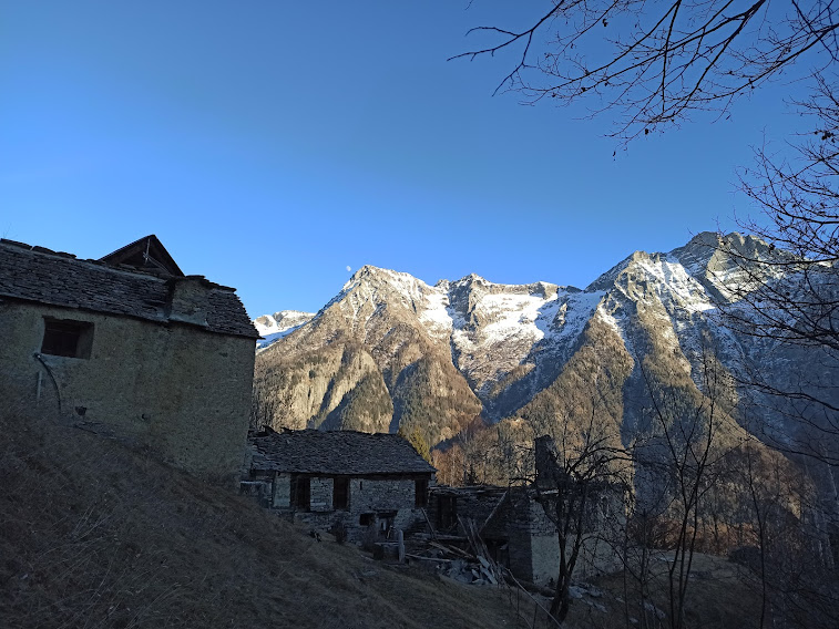 Una signora e sei anziani bevono un caffè a Premia all’alba delle otto e, in auto, salgono alla frazione Albogno, 885. Inutile aggiungere cento metri di dislivello su asfalto a quello che oggi ha già previsto per noi la nostra rocciosa guida walser indigena.