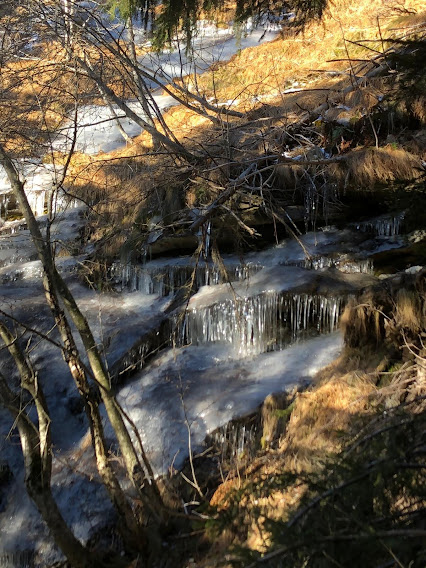 Da Termine si scende decisamente, stando però attenti ad imboccare nel primo tratto il sentiero, non molto segnato, che poi diventa evidente. Nel tratto alto siamo in un bosco di faggi. Durante la discesa incontriamo, più in basso, due guadi di ruscelli completamente gelati. Il primo lo superiamo risalendo di qualche decina di metri sul terreno ripido e “sporco”. Per il secondo ci aiuta una provvidenziale cordina di ferro tesa da mani pietose.