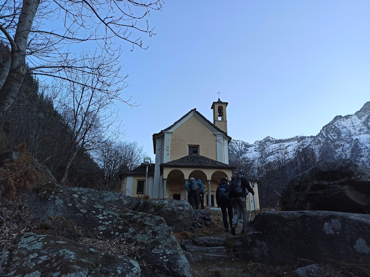 Anche oggi non contiamo sulle cartine più aggiornate, che di alcuni sentieri ignorano l’esistenza, ma sulla grande conoscenza del territorio di chi ci guida. Il primo tratto del sentiero G 17 è pianeggiante, seguito da uno strappo che ci porta in poco più di un quarto d’ora all’Oratorio della Madonna dell’Oro del 1739, a quota 965. Prima breve pausa. La mulattiera bellissima, incredibilmente ricavata su queste pareti strapiombanti, sale decisamente e ci aiuta a non sentire il freddo.