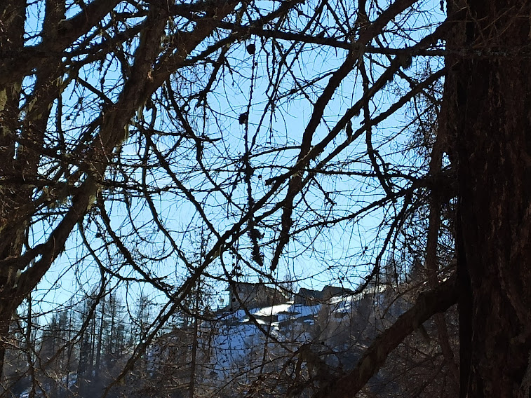 A 1600 incontriamo le prime tracce di neve: che tristezza a metà gennaio! Dopo un’ora e tre quarti, sempre con le ridotte inserite, arriviamo all’Alpe Spotigine (o Spotigene), 1820, dove due amici della nostra guida stanno lavorando ad una bellissima baita. Qui di neve ce ne sono forse venti centimetri, ma solo in ombra e con l’aiuto del vento. Al sole, in tenuta quasi estiva, mangiamo qualcosa con tutta calma.