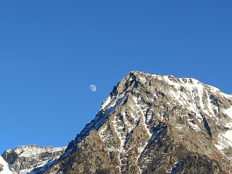 Ci dirigiamo di qui a nord lungo un sentiero non evidentissimo, in leggera discesa, verso quella che per noi è l’Alpe Termine, 1711, La Balma per la cartina. In un tratto in ombra la neve ci fa perdere la traccia e ci abbassiamo troppo. Grazie alla tecnologia ed all’intuito walser recuperiamo il sentiero, dopo aver tribolato per più di mezz’ora su questo terreno impegnativo.