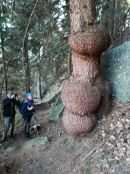 Al bar un amico della guida ci sconsiglia il sentiero che passa da Pianez e La Scala perché deve ancora essere ripulito da decine di alberi abbattuti dal vento. Nella piccola area di sosta assistiamo alle sofferte e inconcludenti manovre per parcheggiare di un anziano ex alpinista, decisamente più portato per altri tipi di attività. Alla fine la vince l’auto che rimane un po’ di traverso. Si aggrega al gruppo, e ci seguirà per tutto il giorno, Iole, una tenera cagnolina molto socievole e dotata di targhetta con nome e numero di telefono dei padroni.