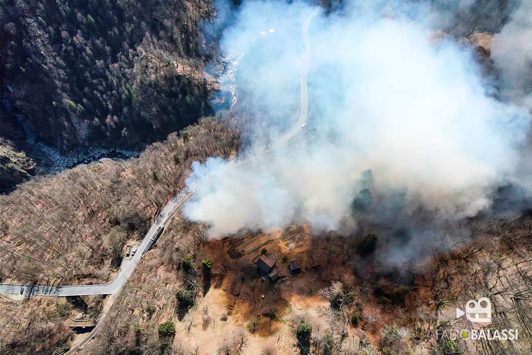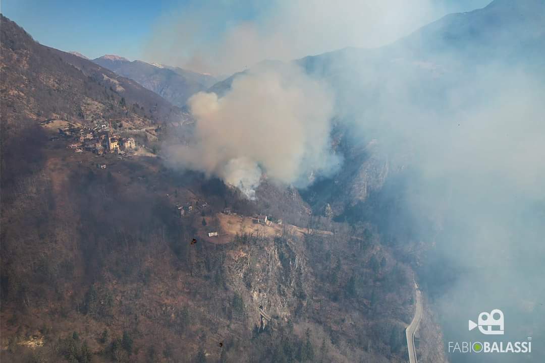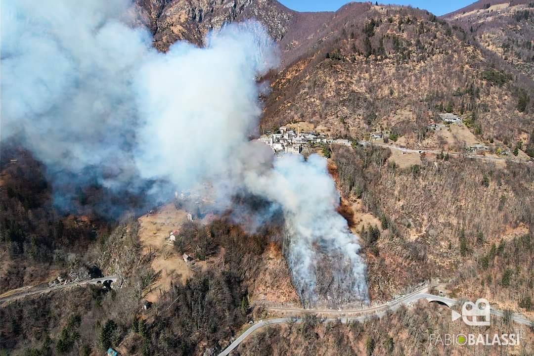 CENTOVALLI - 23-03-2022 -- Un corposo fronte di fuoco e fumo distribuito su tutto il costone roccioso che sovrasta parte della massicciata ferroviaria della linea Centovalli, proprio nel cuore della valle. Questo è al momento lo stato dell'incendio che impegna questo pomeriggio i soccorsi elvetici, con camion e elicottero, nel territorio di Verdasio. Il paese dista poche centinaia di metri sopra le fiamme, sulla balza rocciosa che si erge dal piano della strada cantonale e della ferrovia. Dalla stampa ticinese si evince come l'incendio, che sembra per ora non aver causato ferimenti a persone, si sia originato nei pressi dei binari. Ad ora restano chiusi i principali collegamenti viari. Molta preoccupazione desta la grande siccità dei pendii boschivi di questi mesi.