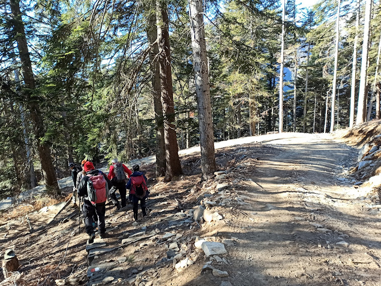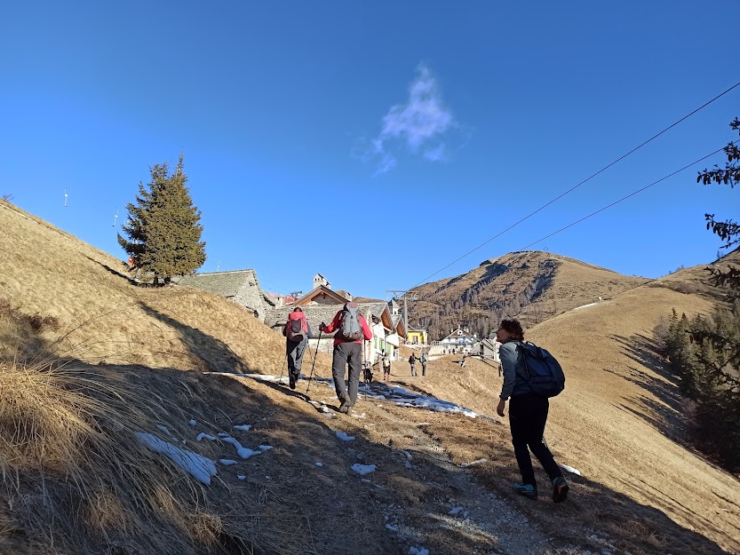 Ancora una splendida giornata! Il che è veramente preoccupante: l’ultimo fiocco di neve è sceso dal cielo un mese e mezzo fa. Poco freddo, niente neve, tanta siccità! Oggi siamo in doppia cifra. Cinque anziani godono della compagnia di due forti signore, di un esordiente nel gruppo, di due medici prestigiosi e di un ex alpinista.