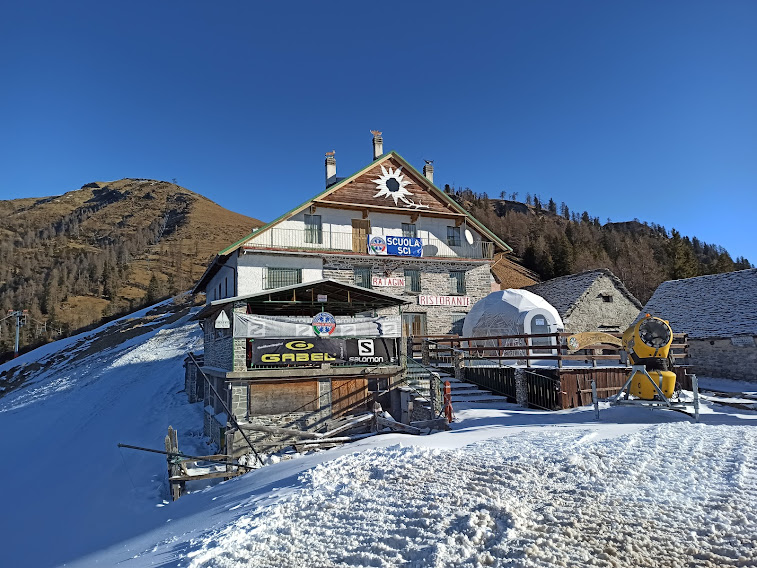 Qui la pausa è un po’ più lunga e ci guardiamo intorno, sconcertati dai pendii del Trubbio in veste autunnale e estasiati dallo splendido panorama. Uno strato modesto di neve compatta consentirà di sciare nel fine settimana nel canalone che scende verso nord ovest. Torniamo sui nostri passi e lasciamo alla nostra sinistra il sentiero percorso in salita, imboccando una pista sterrata pianeggiante diretta ad occidente. Arriviamo rapidamente alle baite più alte dell’Alpe La Colma di Fuori.