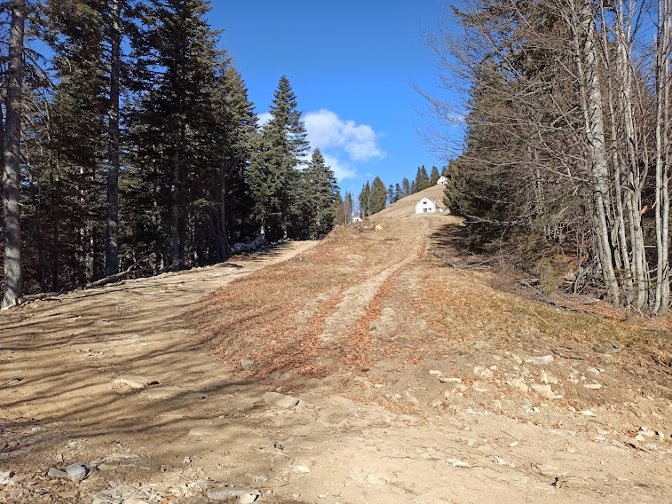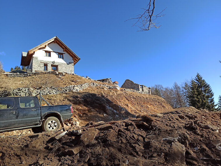 Qui ci sono cartelli indicatori per La Cima, l’Alpe La Colma di Dentro e Arvogno. C’è anche una villa, non baita, che ha la fortuna di avere una pista agro silvo pastorale, in costruzione, che passa a pochi metri. E, appunto, c’è questa perla di pista di cui avevamo visto iniziare la costruzione nell’autunno del 2020 in località Promez di Toceno. Mi dicono che arriverà a La Piana. Scopriremo a cosa servirà. Per ora sta solo devastando bellissimi boschi di conifere e di faggi. Sentiamo il rumore dei mezzi meccanici al lavoro fra noi e La Piana.