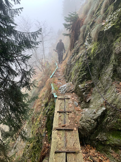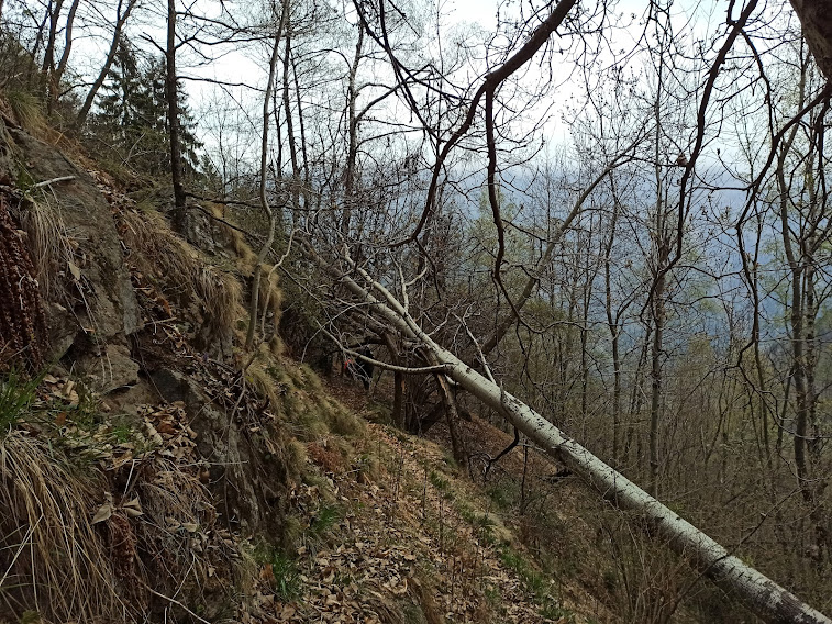Il sentiero C14 diventa C12, diretto a nord. E’ ben segnato, stretto, nelle nebbia, con saliscendi, un po’ esposto e da percorrere con attenzione. Il principale vallone che attraversiamo è quello del Rio Balmel e mi dicono che non ce ne saranno più. Un tratto è ben attrezzato con ponticelli e catene, ma di valloni e vallette ce ne sono tanti altri e ne perdo il conto. Lo chiamerò sentiero dei valloni alla faccia dei miei amici burloni.