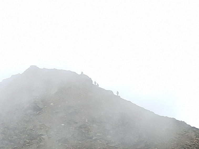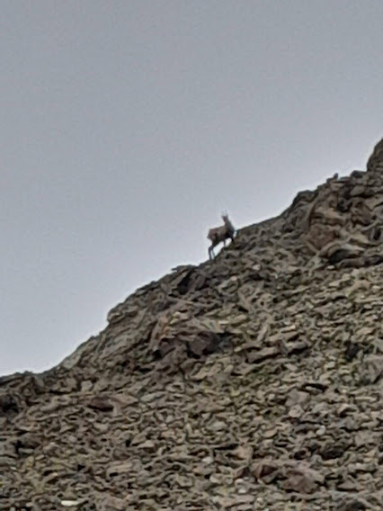 Al termine di questo tratto ripido arriviamo ad un piccolo pianoro a quota 2700. Io mi fermo per conservare un po’ di “benzina” per il ritorno e per non abusare ulteriormente della loro pazienza. Loro salgono rapidamente il tratto finale che li porta, in mezzo a nebbie vaganti, in vetta al Corno Orientale di Nefelgiù, 2834 (due ore e mezza dall’Alpe Nefelgiù). Di qui i loro sguardi spaziano verso la Bocchetta del Gallo e il vallone del Vannino. Dalle creste intorno a noi qualche camoscio solitario ci osserva. Gli amici mi recuperano, quasi meravigliati del mio abbigliamento invernale, mentre loro, in moto perpetuo, sono ancora quasi “estivi”. Ma non c’è come stare fermi nella nebbia e con un po’ di venticello dei “tremila” per raffreddarsi rapidamente. E poi la stanchezza aiuta.