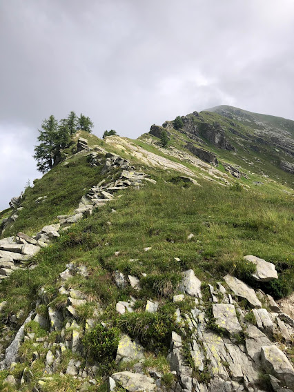 Le nuvole si addensano minacciose, ma pensiamo siano solo di passaggio, viste tutte le previsioni italo svizzere favorevoli. Virando a nord ovest, proseguiamo sul sentiero M25 fino alla Bocchette di Ruggia, 1992. Qui imbocchiamo una esile traccia ripida e, in parte, su piodate che dovrebbe portarci in vetta al Pizzo Ruggia, principale meta dell’escursione odierna. Siamo già passati di qui anni fa, in discesa dal Pizzo, e sappiamo che è terreno che richiede attenzione ed è da evitare se bagnato.