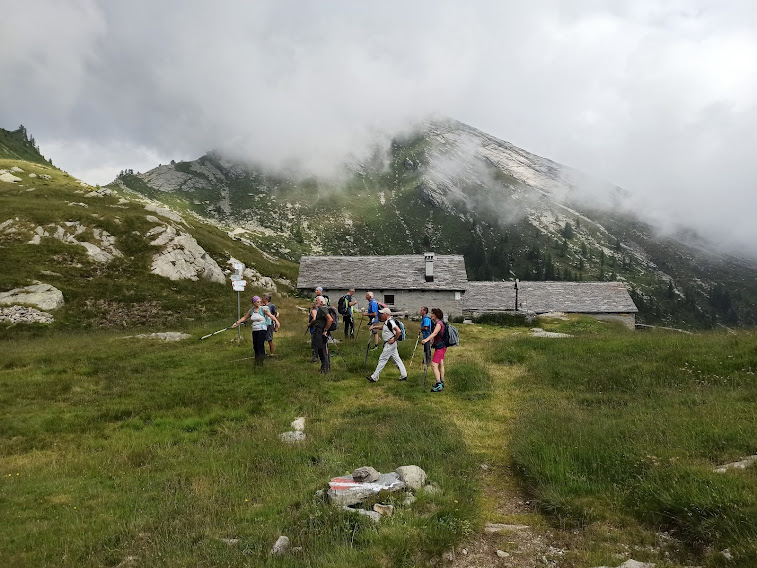 Confortati dalle previsioni meteorologiche ottimistiche, due badanti, tre medici ed un rianimatore accompagnano sei anziani, uno dei quali ex in tutto, alpinismo compreso. Dopo l’esperienza piovosa della scorsa settimana in Formazza, qualche pessimista previdente appesantisce lo zaino con l’ombrello. Parcheggiamo a Prestinone. Insieme ad altre compagnie ancora più ottimiste di noi, con zaino da funghi e biciclette, e a lavoratori con relative attrezzature e materiali saliamo a La Piana di Vigezzo, 1725, in ovovia. Evochiamo i tempi passati, quando ancora nevicava, e qui salivamo con la scuola o per i campionati studenteschi di sci. Ma siamo proprio così anziani? Per fortuna la badante più giovane ed il suo ragazzo abbassano l’età media.