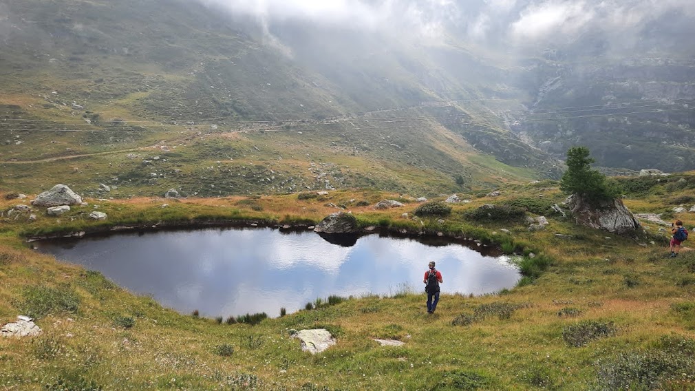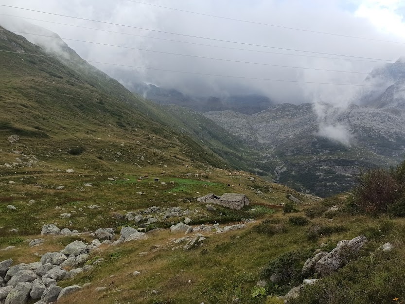 La bella sorpresa per noi vittime del calore del fondovalle per sei giorni alla settimana è la temperatura di 16 °C alla Cascata del Toce, 1680, dove parcheggiamo di fronte all’Oratorio di San Domenico. Ci dirigiamo a nord, in dolcissima salita fino a Frua di Sopra. Qui il sentiero evidente vira a oriente, destra, e il pendio diventa impegnativo. Nella nebbia si suda in modo anomalo, nonostante la temperatura fresca e, dopo un’ora, un cartello indicatore ci racconta che siamo all’Alpe Ghighel, 2125. Il passo vivace della nostra guida walser ha reso bene.