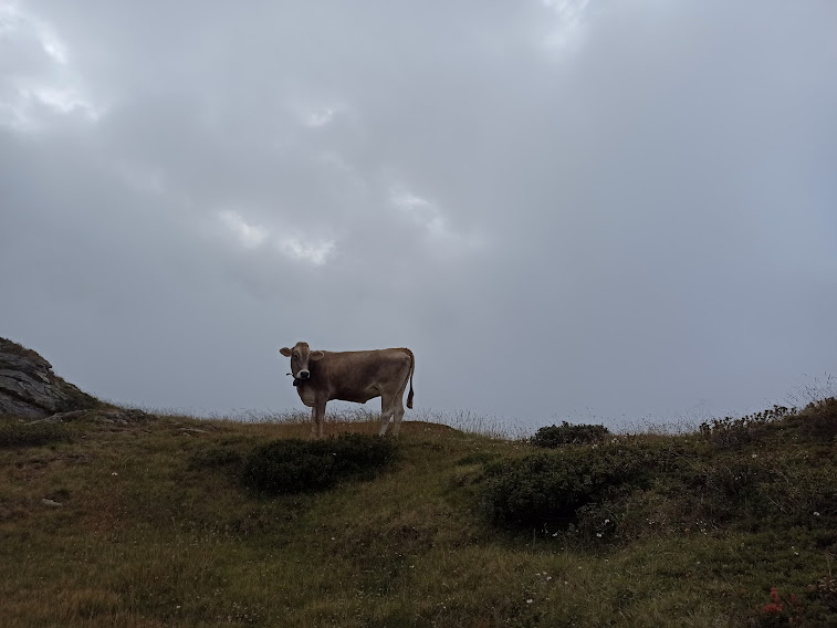 Un’arietta frizzante e qualche sprazzo di sole ci consentono un timido panorama e ci lasciano immaginare cosa potrebbe essere con il cielo sereno. Vediamo con piacere molte vacche al pascolo. Viriamo decisamente a sud e riprendiamo in morbida salita in questo ambiente bellissimo. Ci sarebbe qualche traccia, ma, con la visibilità odierna che cambia continuamente, è molto importante la presenza di un esperto del territorio.