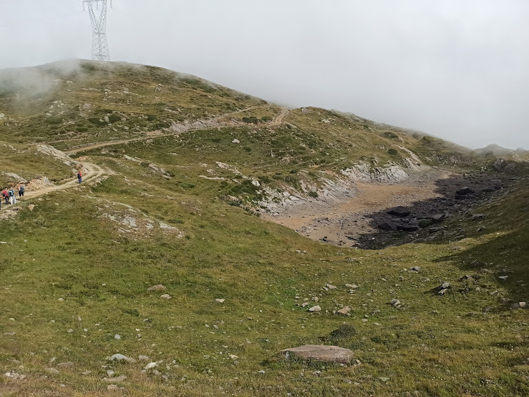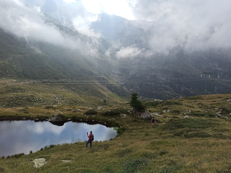 E’ tutto bello, ma tutto uguale: verdi radure, vallette, piccoli stagni. Dopo mezz’ora, senza fretta alcuna, arriviamo alla piccola torre, o meglio grande ometto in sasso, sulla vetta del Monte Castello, 2218. La Cascata del Toce è a picco sotto di noi, ma non si vede. Ritorneremo qui con visibilità migliore, quando dovremo accontentarci di questi dislivelli. Torniamo all’Alpe Ghighel e, sempre fra nebbie e sprazzi di sole, rinunciamo, quasi con piacere, al Lago Nero. L’idea di un pranzo come si deve al ristorante ci stuzzica non poco.