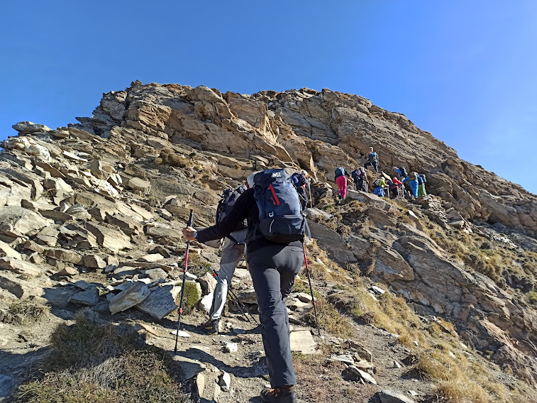 Siamo in ombra e anche la fresca temperatura ci aiuta. Occorre attenzione perché il sentiero è sì bello, ma “traversiamo” su terreno ripidissimo dove uscir di strada è tassativamente proibito. A quota 2300, a Kläna, cominciano finalmente a presentarsi alla nostra sinistra dolci pendii, che prendono il posto dei precipizi rivolti verso Briga. Ci raggiunge anche il sole e sostiamo brevemente. Qui la rotta s’inverte verso sud est, con sentiero e pendenza sempre ottimali.