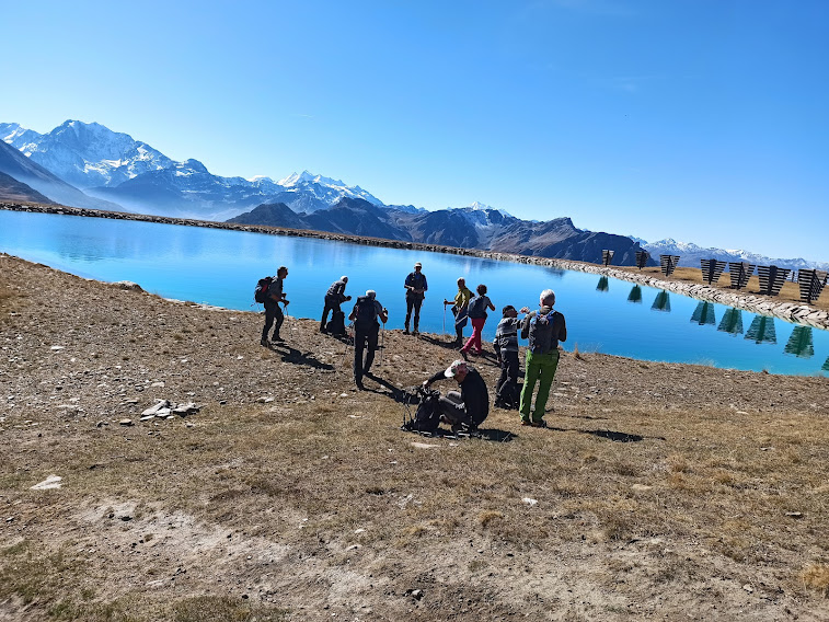 Qui sostiamo per quello che è un aperitivo secondo gli amici, ma per noi è un lauto pranzo. Ci dicono di limitarci perché è in programma una merenda, ma non è facile. Torniamo su terreno facile, dolci pendii, prima verso sud e poi sud ovest. Incrociamo il sentiero che va verso Binn ed arriviamo ad un laghetto artificiale per la produzione di neve, a quota 2300 circa.
