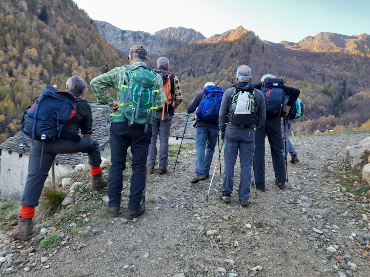 In una splendida giornata, con temperature ideali per faticare, ci ritroviamo in undici all’imbocco della Val Vigezzo e proseguiamo per l’ormai istituzionale caffè all’Orso Bianco. C’è un gradito ritorno in forze del gruppo di Verbania. Solo la badante titolare non ci ha mai abbandonati ed oggi è supportata da tre medici per badare a ben sette anziani, di cui uno particolarmente impegnativo.