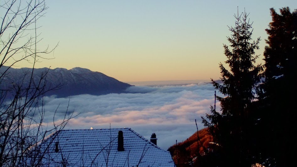 In otto più un quadrupede raggiungiamo Cheglio, frazione di Trarego. Scesi dalle auto (quota 771), ci accoglie subito uno stupendo scorcio del lago, coperto da un mare di nuvole. In alto c’è tantissima neve ed il bosco è un tutt’uno con la massa bianca che lo ricopre.