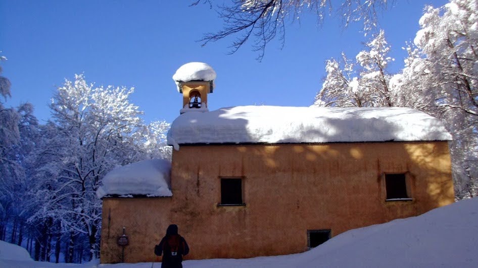 Nel nostro gruppo non si resta mai da soli! Gli altri cinque raggiungono l’oratorio di Sant’Eurosia a quota 1055. Il sole scioglie la neve sugli alberi e ci si attrezza come quando piove, con copri-zaino e giacche a vento. Fino a qui un’ora e tre quarti (di solito ci s’impiega un’ora). Si sale a destra nel bosco e si raggiunge la bocchetta, a quota 1181, fra Cima Tondone e Cima Forcola.