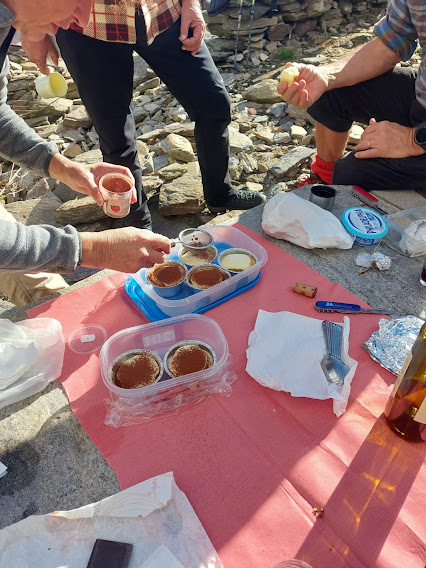 Più che altro lei festeggia noi perché dal suo pesantissimo zaino, che ha tenuto rigorosamente chiuso fino a qui impedendoci di condividere con lei parte del peso, esce ogni ben di Dio. Un dessert personalizzato al momento con tutti i necessari accessori è la ciliegina sulla torta.