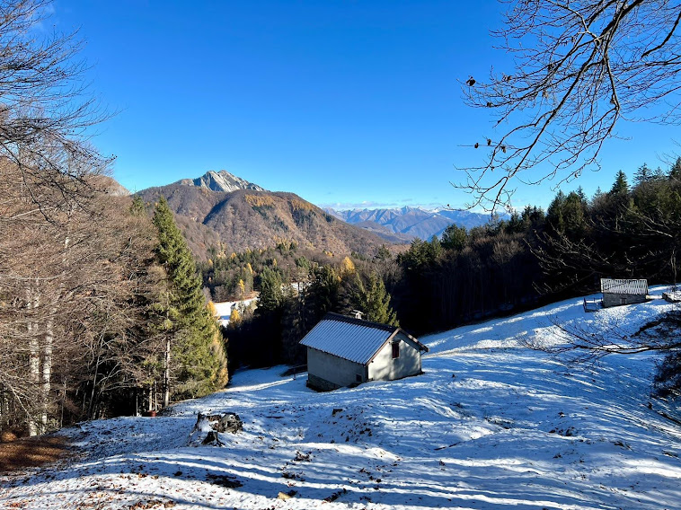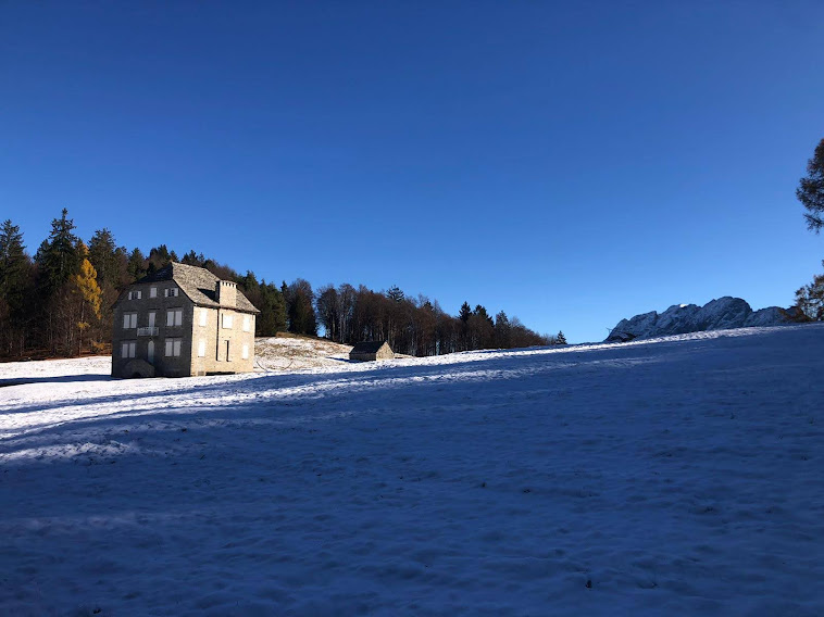 Iniziamo a scendere, passando dalla Colma di Villette, dove le nostre badanti si consentono una meritata pausa ed un giro in altalena. Diretti a nord est, in questo territorio meraviglioso, attraversiamo un vasto prato innevato dove una grande villa in sasso fa da sfondo alle nostre foto di gruppo. Il panorama va dal Gridone ai quattromila.