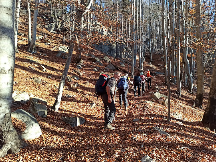 Ci scaldiamo con il primo sole e con il primo tratto del percorso abbastanza ripido nel bosco di faggi, con le solite foglie che ormai da qualche mese ci accompagnano, mettendo a dura prova il nostro equilibrio.