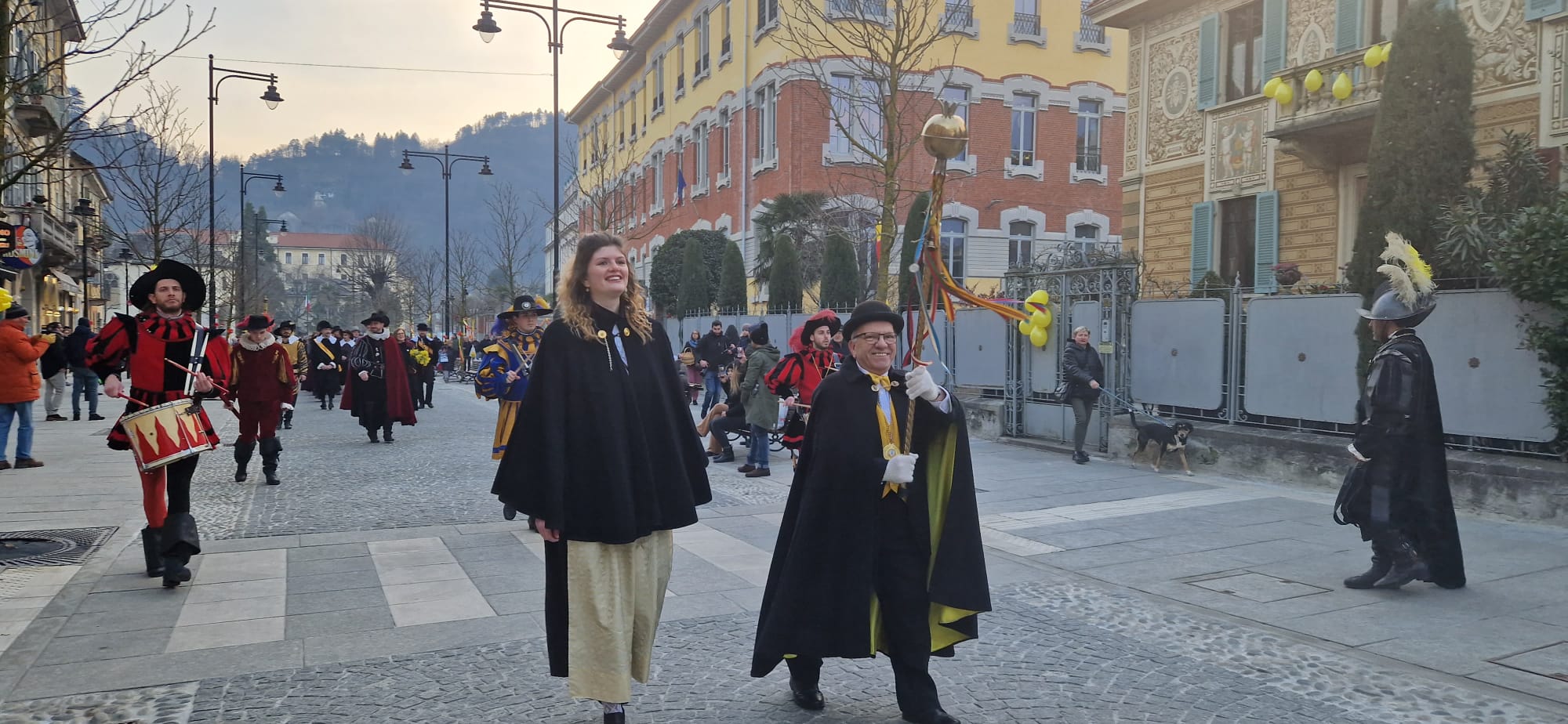 DOMODOSSOLA- 11-02-2023-- Al via il Carnevale di Domodossola: oggi lungo le vie del centro, la corte di Mattarella ha accompagnato il Togn e la Cia, a suon di tamburi, sino a Palazzo San Francesco dove si è tenuta la tradizionale consegna delle chiavi della Città.