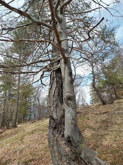 Ci dirigiamo a est nord est su pendenze morbide che, nella parte alta, si addolciscono ulteriormente quando camminiamo nel bellissimo bosco dei miei amati faggi. Un larice e un faggio fratelli gemelli sono una meraviglia della natura. Con passo tranquillo arriviamo all’Alpe Pluni, 1454, dopo un’ora e mezza. Qui c’è una baita ristrutturata nel 2002 dall’Associazione Pro Monte Vecchio in “Rifugio Comunale d’Alp”, come recita una grossa targa. Ad oriente domina il Gridone.