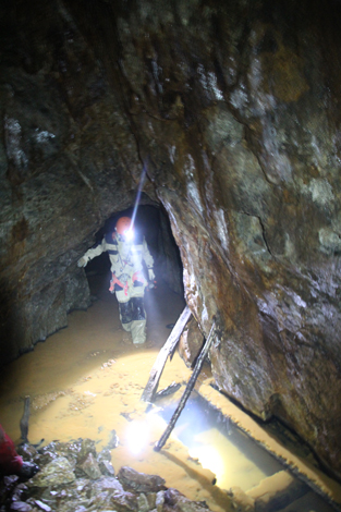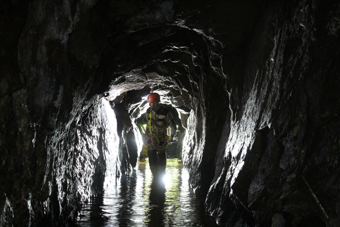 Alla nostra destra vi è una discenderia che va probabilmente ad uno scavo sul filone, oppure ad un livello sottostante a noi, che essendo completamente allagato ha formato sul passaggio questo fantastico "buco blu" di acqua purissima di una limpidezza da togliere il fiato. Possiamo infatti ammirare la galleria allagata che va verso il basso fino a che le nostre torce ci permettono di vedere.