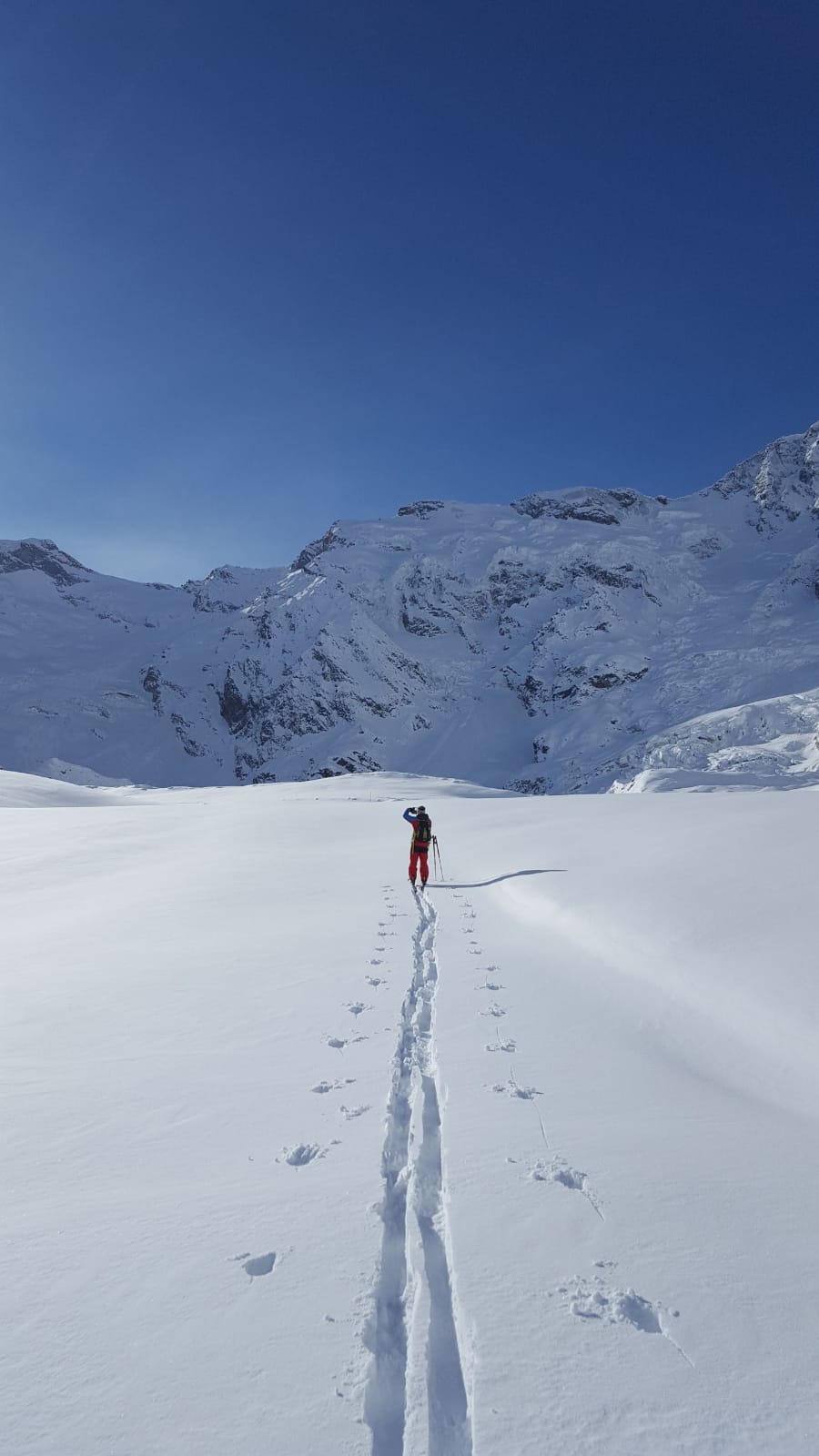 Due giorni fa, martedì 28 gennaio, sono caduti venti centimetri di neve fresca a Pecetto e quasi il doppio a duemila metri. Mi hanno anche confermato che si può risalire con le pelli di foca sui bordi della pista battuta, con buon senso. In attesa che il manto bianco, finalmente abbondante, si stabilizzi, cosa c’è di meglio di una sicura e tranquilla escursione al cospetto della parete est? I Trotapian oggi hanno scelto gli stupendi panorami del Lago Maggiore dal Monte Carza. Un mio concittadino forte ed esperto, con molti anni e molti chili meno di me, predilige anch’egli la neve e il vento freddo del Monte Rosa. La morbidissima pendenza da Pecetto all’Alpe Burki non ci riscalda neppure. Siamo ancora in ombra, pochi gradi sotto lo zero. Da qui saliamo sulla pista di destra, in presa diretta, e i gradi angolari aumentano bruscamente, non quelli termometrici. Finalmente un po’ di sano sudore! La neve è liscia come un biliardo e ci pentiamo quasi di non aver prediletto una bella sciata in pista. Certo che mi rattrista vedere qui pochissimi sciatori in una giornata stupenda e con le piste del Moro ancora chiuse. Prima dello strappetto finale più ripido, ci portiamo a destra su pendenze nuovamente dolci, dove passava una volta quella che chiamavano “pista dei camosci”. Proseguiamo lasciando la pista battuta alla nostra sinistra e, di qui in avanti sempre in neve fresca, percorriamo un traverso quasi pianeggiante. Alla nostra destra sprofonda l’ultima coda del grande ghiacciaio. Ci ricongiungiamo con la breve discesa che si percorre dalla conca del Belvedere in direzione dell’Alpe Fillar. Qui solitamente è ben battuta una bellissima pista per sci-alpinisti e ciaspolatori che percorre in modo spettacolare il ghiacciaio in direzione del Rifugio Zamboni e del Lago delle Locce. La nevicata recente non ha ancora permesso di batterla e quindi dobbiamo pensarci noi, aiutati dalle paline evidenti. Fra l’altro, siamo i primi della giornata. Soltanto un camoscio l’ha appena percorsa. Trattandosi di un’uscita “d’allenamento”, va bene così. Se ne occupa il mio forte compagno d’escursione per rispetto all’età, ma i miei quindici chili in più fanno sì che anch’io contribuisca non poco alla battitura. Certo che una pista vergine con neve bella di fine gennaio è un piacere sempre più raro. Incontreremo quattro sci-alpinisti soltanto più tardi durante la discesa. Arriviamo all’intaglio sulla dorsale che separa il ghiacciaio dalla conca dell’Alpe Pedriola. Il rifugio è circa 50 metri sotto di noi, ma per raggiungerlo si dovrebbe tagliare un ripido pendio immacolato carico di neve. Preferiamo evitare grane sicure e ci prepariamo per una incantevole discesa, tutta per noi, che non ci saremmo mai aspettati. Così è. A Pecetto fatichiamo non poco a spiegare a due ciaspolatori che l’unica pista di salita per loro è il seggiolino della seggiovia. Certo che un tracciato riservato anche a loro non costerebbe molto. Trentinus docet? Non si direbbe.