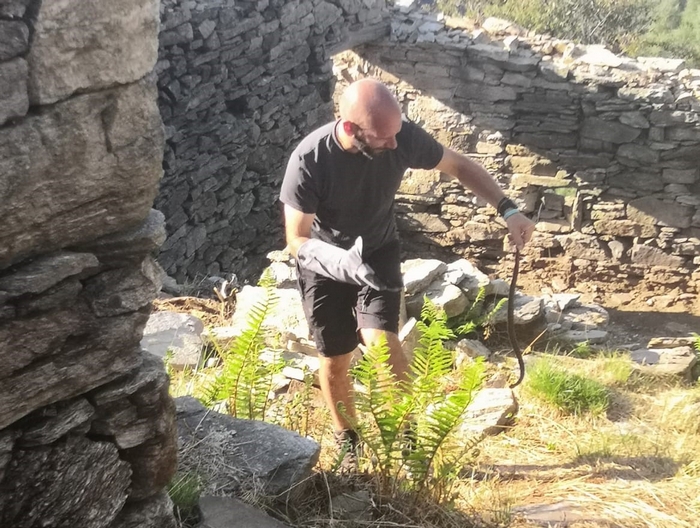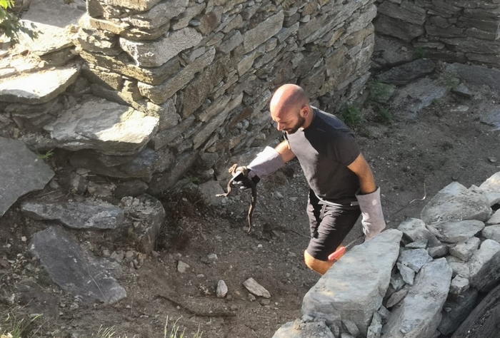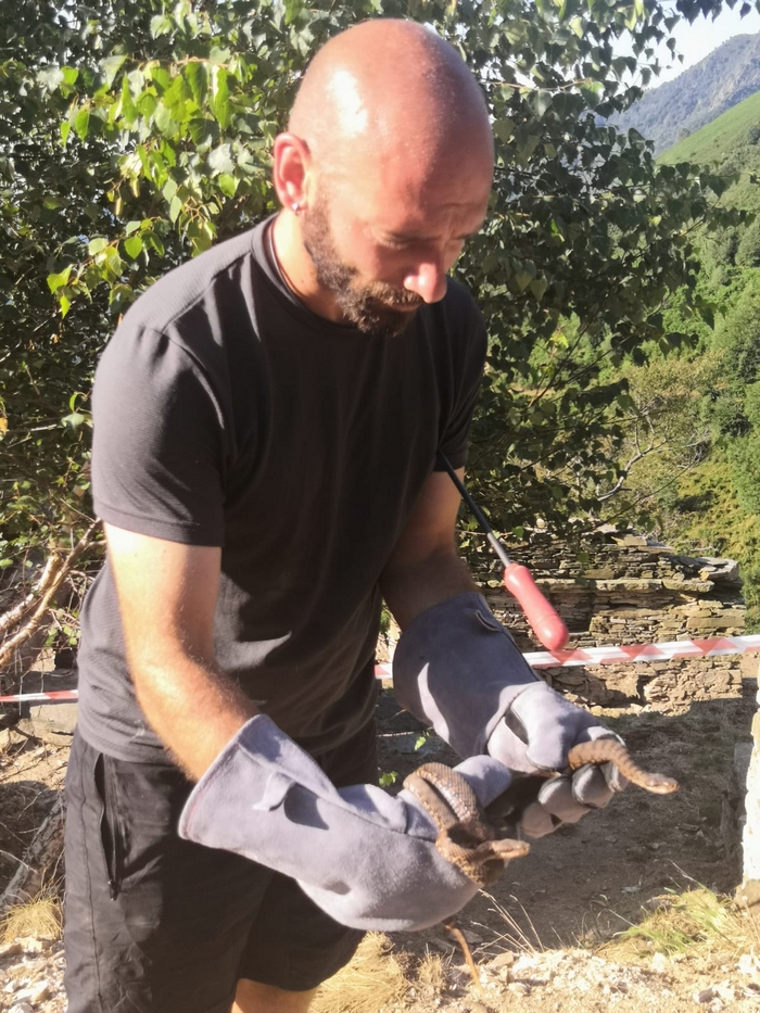 al trasloco forzato. Con l’abbandono della montagna da parte dell’uomo, i ruderi di quello che un tempo era stato un alpeggio in Valle Intrasca, erano diventati la casa di tre vipere (vipera aspis, il nome scientifico della specie) femmine, due delle quali in procinto di partorire le proprie uova. Vivevano indisturbate in quel luogo sino all’arrivo (o, meglio, al ritorno) dell’uomo. Alla Corte Bavarone, alpeggio situato nel comune di Aurano, ai piedi del monte Zeda, sono infatti in corso i lavori di recupero di quei ruderi, nell’ambito del progetto “Ritornare”, con il quale il comune di valle intende rilanciare, in chiave moderna, attività zootecniche. Nei giorni scorsi gli operai della ditta incaricata della ristrutturazione delle baite hanno fatto la conoscenza delle vipere, informando il direttore dei lavori Renato Locarni. È stato così chiamato Lorenzo Laddaga, erpetologo (esperto di serpenti), che ha prelevato i tre esemplari e li ha liberati in un luogo distante, dove non è prevista la convivenza umana.