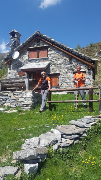 In una bella giornata di fine primavera tre anzianotti ed un giovane neopensionato si ritrovano a fondovalle e proseguono, con il lusso di due auto, verso Canei, frazione alta di Crevoladossola, sopra Preglia. Durante questo avvicinamento i due giovani tentano di raggiungere la stazione ferroviaria di Preglia, sperando vanamente di trovare un treno locale per l’Alpe Andromia. Da Canei si prosegue sulla strada ripida e tortuosa fino a Onzo e si parcheggia prima della sbarra che nega l’accesso ai cittadini di serie B, a quota 850 circa. Il sentiero ripido e ben segnato taglia spesso la strada. Camminiamo fortunatamente in ombra e, in meno di due ore, arriviamo alla bellissima spianata dell’Alpe Fuori, 1533. Una pausa tranquilla di foto e contemplazione. Gustiamo finalmente il ritorno con i nostri amici sulle nostre montagne: è una sensazione che “si respira” a pieni polmoni, Covid permettendo.