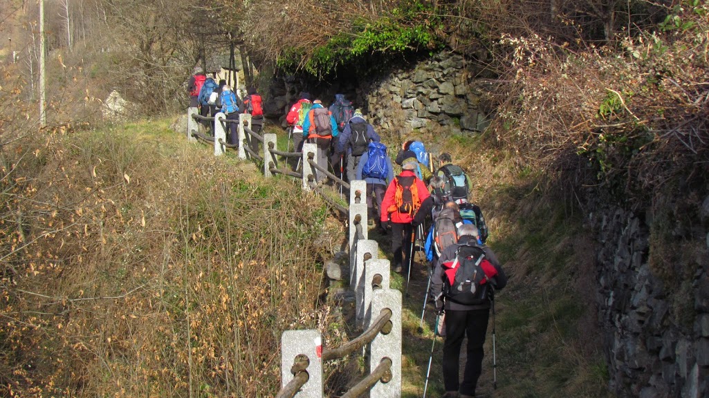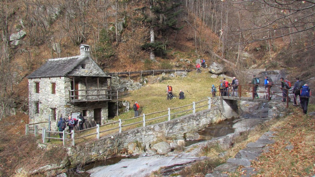 Si parte con il sole, ma sappiamo che non ci accompagnerà per tutto il giorno. L’unica certezza, per ora, è che non troveremo il subdolo strato di ghiaccio che due anni fa, su questa bella mulattiera, costò cinque costole ad un amico. Dopo una breve discesa attraversiamo una valletta e risaliamo a Meggiana, 520, dove incontriamo il primo dei tanti forni per la panificazione. Passiamo poi da Meggianella e risaliamo alla grande cappella di Borca, 629. Qui troviamo un amico dei nostri soci di Pieve Vergonte che si sta occupando dell’organizzazione di una prossima gara di corsa in montagna. Lui è stato un grande atleta di questa specialità e ci permettiamo subito di considerarlo socio onorario del nostro gruppo e di camminare un po’ con lui. Ci omaggerà anche di un bellissimo filmato, eseguito con il suo drone, che recepisce perfettamente lo spirito dei Trotapian. Arriviamo a Pero, 625, poi a Villasco, 694, e di qui al “Mulino dul Gabriel”, sulla destra orografica del Rio Preggia.