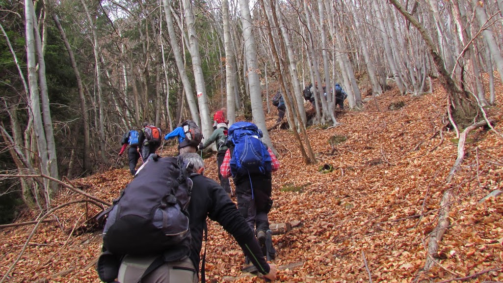 Camminiamo da un’ora e mezza e ci concediamo una pausa contemplativa. Di qui il sentiero sale ripido nel bosco di faggi e ci porta, in poco più di mezz’ora, sullo splendido balcone di Drocala, a quota 940, luogo ideale per una breve colazione. Intanto compaiono le prime nuvole e l’aria si rinfresca, ricordandoci che è ancora inverno e che i venticinque gradi dei giorni scorsi erano una pura illusione. Per fortuna! Poco sopra Drocala arriviamo in una radura, in prossimità dell’Alpe Prailer, dove troviamo una vecchia fontana. Qui i sentieri si dividono. Noi teniamo la sinistra (occidente), proseguendo fino all’Alpe La Barca, 1094, e l’Alpe Prer, 1150, la Cima Coppi del tour odierno.