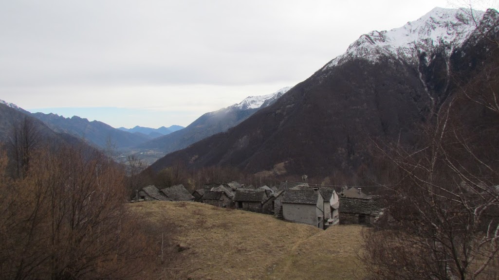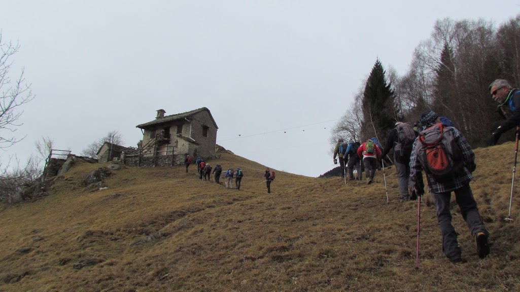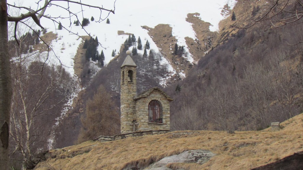 Circa tre ore dalla partenza, pause escluse. Cerchiamo di ripararci al meglio fra le baite per mettere qualcosa sotto i denti al riparo dall’aria gelida che ci manda il Monte Rosa. Le giacche a vento leggere oggi hanno scarso successo, alla faccia del “riscaldamento globale”. Saliamo rapidamente a fotografare la cappelletta con il suo campanile in miniatura che si trova nel vasto ripiano sopra l’alpe. E poi discesa in picchiata fino a Olino, 845, e Crotto, 630. Di qui raggiungiamo rapidamente Ielmala, 658, e scendiamo a Castiglione, 514, su sentieri sempre evidenti. Risaliamo a Case Paita e, a Borca, chiudiamo l’anello odierno. Troviamo il tempo di immortalare l’amico con le cinque costole ben saldate sull’innocuo scivolo traditore che ben ricorda. Ripassando da Meggianella e Meggiana ritorniamo al parcheggio, accompagnati da un’improvvisa nevicata che ci ricorda che è ancora febbraio.