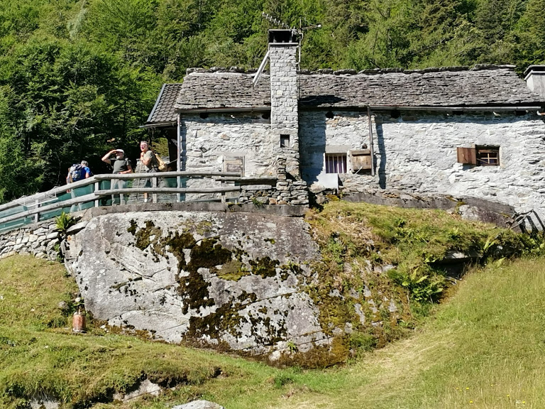 Camminiamo da quattro ore. La baita del nostro ospite di oggi è estremamente accogliente e si vedono le migliaia di ore di lavoro, negli anni, che lui ha dedicato con genialità a rendere così accogliente questo angolo di paradiso. L’aperitivo, soprattutto allo stato liquido, è gustoso e abbondante, c’è di tutto. All’unanimità, tranne il solito contestatore ignoto sempre ricco di appetiti di ogni tipo, si decide di rinunciare alla pasta programmata. Pigramente, molto più tardi, scendiamo a valle proseguendo verso occidente lungo il sentiero che poi vira a nord nel ripido bosco. All’Alpe Salviggia, 850 circa, troviamo la strada, con sbarra, che sale a Nugno. In parte su questa, passando dall’Alpe Tugliaga, e in parte sul sentiero, per evitare due gallerie, arriviamo a Ponte Cantone, 520. Insieme ad altri, mentre gli autisti recuperano le auto, incremento un po’ lo sviluppo della gita e raggiungo il centro di Varzo. A casa del creatore di Selvanera di Dentro, che raddoppia la sua squisita ospitalità, recuperiamo abbondantemente le calorie bruciate oggi da gambe e mandibole.