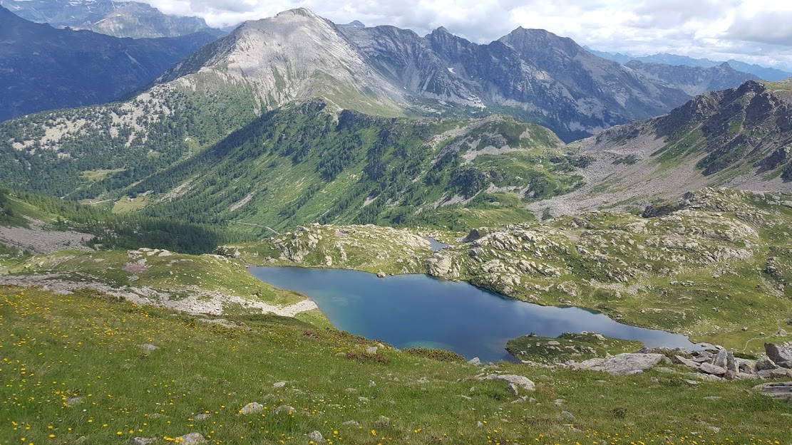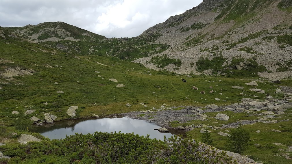 Dopo il pranzo, diretti verso nord, ci dirigiamo alla Bocchetta di Gattascosa, 2149, e al suo laghetto. Poco prima di arrivarci optiamo per un percorso nuovo per noi. Secondo la cartina ci sarebbe un sentiero evidente, ma non è proprio così. Ci abbassiamo verso sud ovest, ma un po’ troppo a destra. Grazie a un GPS risaliamo un breve tratto e ritroviamo il sentiero. Passiamo in prossimità dell’ennesimo laghetto e del pianoro circostante con vacche elvetiche che pascolano sulle sue rive. Risaliamo circa cento metri e sostiamo brevemente a Tschawina vicino ad una bellissima baita. Dopo una breve discesa chiudiamo l’anello inventato oggi al laghetto di Waira. Soddisfatti di questo nuovo percorso in questa valle incantata, su e giù per laghi e laghetti, scendiamo all’Alpe Waira ed alle auto lungo il tragitto di salita del mattino. Qui non ci si annoia mai. E siamo a due passi da casa.